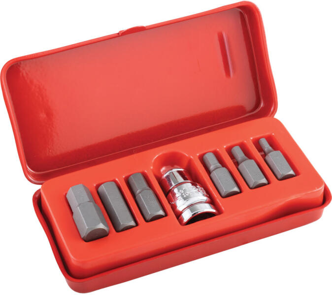 Hatszög bitek, 10 mm-es csatlakozóval. 1/2" négyszög x 10 mm hatszög átalakító a meghajtás érdekében. Készlet összetétele: Hatszög 4, 5, 6, 8, 10 és 12 mm. Hordozható, zárható er's fémdobozban.