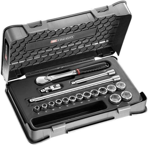 FACOM Dugókulcs készlet nagy teljesítményű irányváltós racsnival, 6 pontos, 3/8, metrikus méretek - 18 db-os FACOM Karbantartásmentes irányváltós racsni, 3/8, 210 x 29 mm