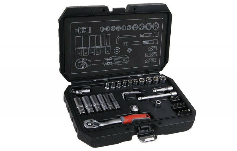 A high-quality gola set is suitable due to the quality of the materials used and the processing in a professional car workshop or service center. 10 year warranty. All parts are made of high-quality chrome-vanadium steel. Nickel finish. Bit tips are S2 alloy steel. The ratchets have a fine division of 72 teeth, the body of the ratchet is made of CrV steel, the tooth mechanism is made of S2 steel, and the handle is ergonomically shaped with harmless rubber. New design primary material plastic case with metal closures and lid hinges.