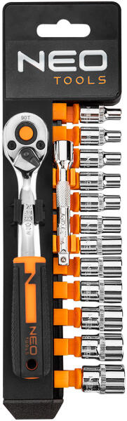 A NEO 1/4"-os dugókulcs készlet 14 db kiváló minőségű króm-vanádium acélból készült elemből áll. A készlethez tartós, precízen működő 90 fogas kilincsművel ellátott racsnis hajtókar is tartozik. A készlet részét képezi a dugókulcsok gazdag sorozata is (4-13 mm közötti méretekben). Ezt egészíti ki egy praktikus 75 mm hosszú hosszabbító. A szerszámok praktikus akasztóval csomagoltak. A szerszám minőségét bizonyítja a TÜV tanúsítvány és a gyártó által nyújtott 25 éves jótállás. A NEO márka a professzionális igényeket is kielégíti.