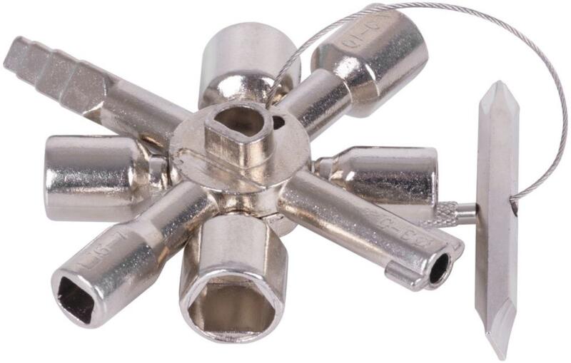 Ez a sokoldalú kulcs ideális az épületgépészeti berendezések, mint például a fűtési, szaniter, légkondicionáló, elektromos, gáz-, víz- és elzárórendszerek valamennyi gyakori zárórendszerének vezérlésére. A sokoldalú kulcs ideális az épületgépészeti berendezések valamennyi gyakori zárórendszerének vezérlésére A kulcs 10 profillal és 2 keresztprofillal rendelkezik, így széleskörű alkalmazást tesz lehetővé. A 8 karos változat két 4 irányú pókkulcsot kombinál, amelyek kényelmesen össze vannak kötve egy tömör acélkábellel. Tartalmaz egy cserélhető 1,0 x 7 mm-es hornyos bitet és egy PH2 keresztbitet.